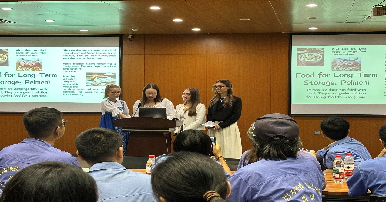 课堂上,互动氛围热烈融洽。中策橡胶集团的学员们向留学生详细介绍了企业发展历程与业务领域,留学生则分享了俄罗斯的城市风貌与文化特色;双方围绕当天的培训主题对中俄饮食文化展开深入交流,从俄罗斯的红菜汤、列巴,到杭州的西湖醋鱼、东坡肉、龙井虾仁以及著名四川火锅,这些美食话题让中俄青年的国别距离迅速拉近。